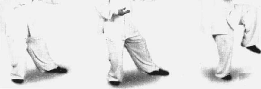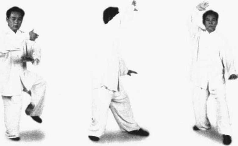 2. 腰身仍右微转,左脚提起,脚尖自然下垂,右手仍弧形 向右斜角上移,高与肩齐,掌心朝上。左手继续向右弧形落于右