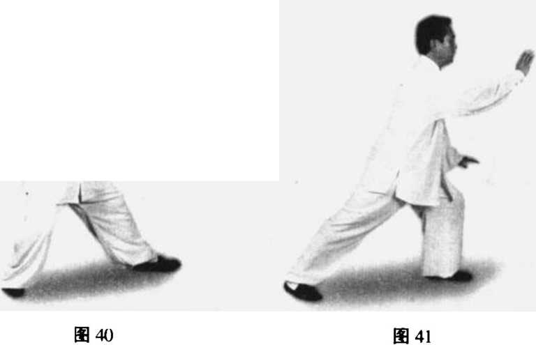 3. 左脚向前迈出一步,先脚跟落地,左掌向前下移至腹中 线,掌心朝下,而右掌同时向肩、耳旁移动,内旋使掌心朝前 下,同时腰身稍向左松转(图40)