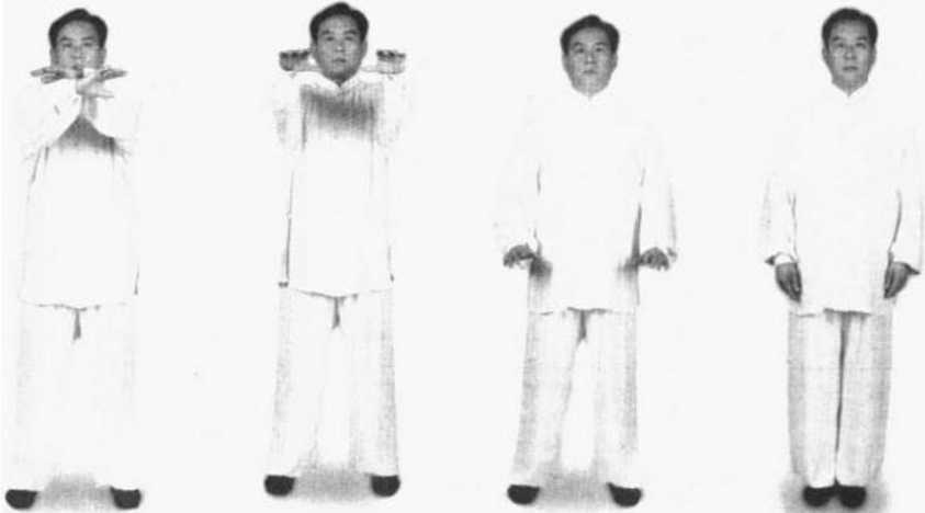 动作:两掌向前伸,同时两臂内旋使两掌心转朝下,左手经右手背 上左右分开同肩宽,随即两肘下沉,自然带动两掌徐徐下按至两 胯旁前,手指朝前,掌心朝下。最后,两臂与两手自然下垂,左 脚也轻提起落下与右脚并拢,收回,眼向前平视(图212、213、 214、 215)O图212 图213 图2M 图215要领:收势,也叫合太极,由动变静,徐徐收敛心意气息,最后, 眼神也要自然收敛。