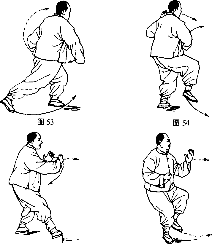 1. 接前势,身体重心不变,左脚尖外撇45度,腰身渐左 转,左脚踏实。继而左胯微内收下沉,右脚跟离地,使身体重心 渐前移于左腿。同时,右掌微向左下弧形移动,随移随变掌为 拳,移至腹前使拳心朝下。左掌也随转体向左后移,『臂略外 旋,使掌心微朝里下。眼神顾及右手下移,头部仍须正直。(图 53)