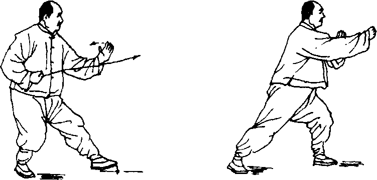 6. 腰微左转,同时重心渐移于左腿,左脚踏实,弓左腿,