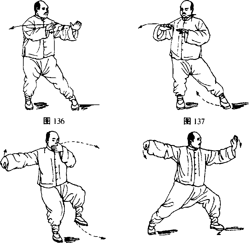 动作和要领均与第四式“单鞭”同。(图136、137、138、