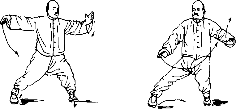 3. 腰微左转,右腿提起,先脚跟后脚尖离地,向左脚旁横 向移动,小腿脚腕自然放松下垂,与肩宽,同时右掌随转体九右 下经腹前向左上弧形运转,掌渐渐外旋,使掌心渐渐翻朝里;左 掌也同时配合,缓缓向左上运出,随运随着臂外旋使掌心翻朝左 前,坐掌,与肩平。此时右掌也运至左肘弯里侧,与肘齐;两臂 呈弧形。眼随体左转移视,眼神关及右掌左运?(图142)
