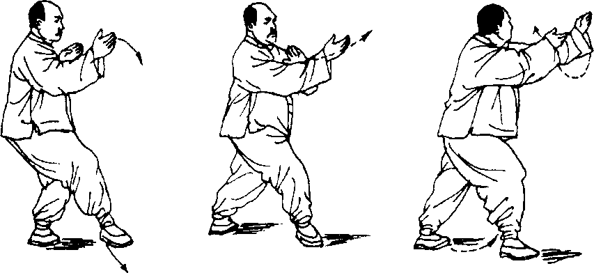 1.右脚下落,左腿渐渐下蹲,身微右转。同时,左掌屈肘 向右弧形划至胸前,掌心朝下;右掌臂外旋使掌心朝上,并随体 沉而沉肘稍下落,右掌随下落自右前稍往里划弧。眼神关顾右 掌」图160)