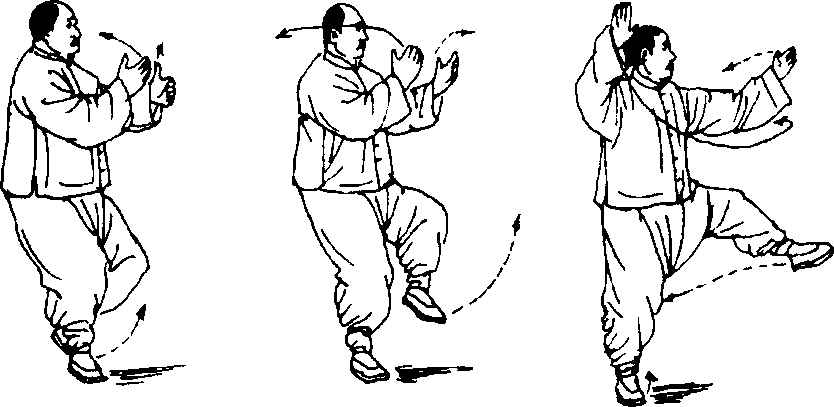 心全部移于左腿时,腰要同时地松沉向左转而带动右腿提起,右 腿应提膝与腰齐。同时左手采右掌挪,随腰而移抄.此时应注意 因左手移动的距离短,右手抄的距离长而出现左手等右手的现 象,左手应随腰而缓移,与右手、腰、腿一动俱动,一静俱静C 此时为合,为蓄,为起;当右腿分出,两掌前后分开时,左腿仍 须徐徐起立,腰微右转,裆要开,左胯微收,气沉丹田,胸含背 圆,松肩松肘,此时为开,为发。配合以呼,意注内、外三合, 方能做到腿部稳定,立身中正。