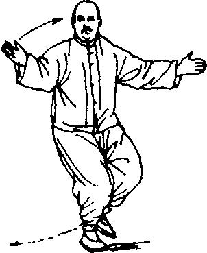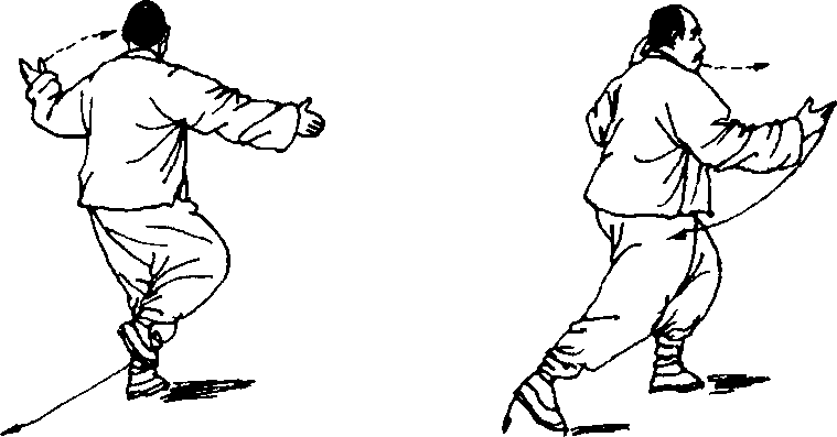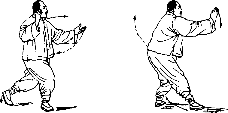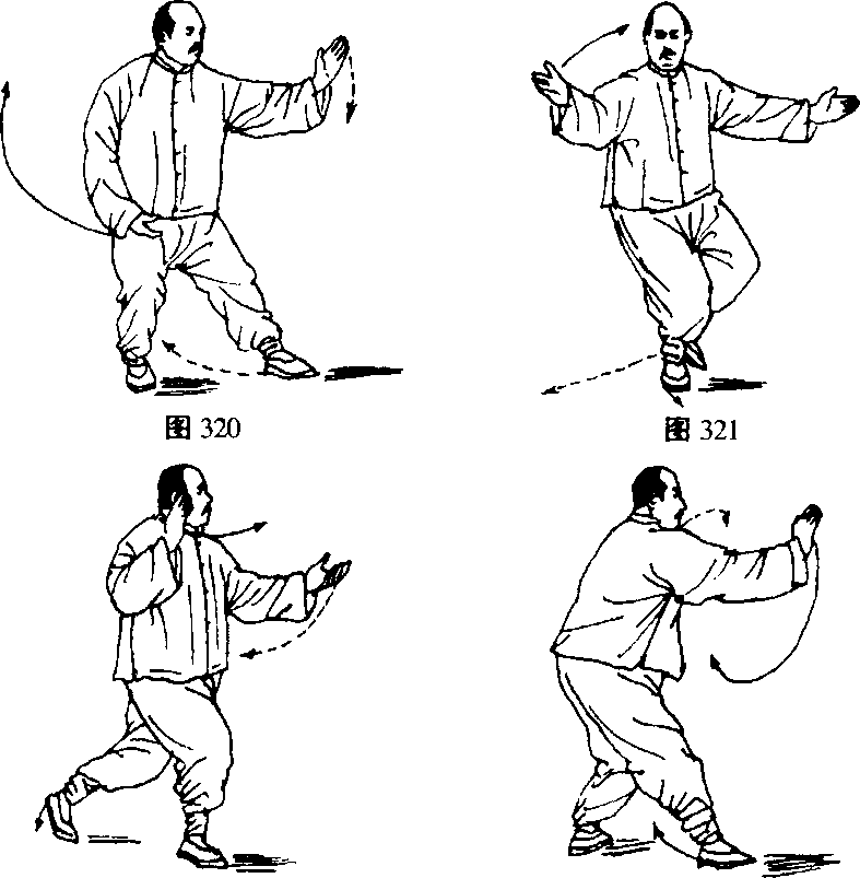 (一)右倒撵猴动作:1.右腿渐渐屈膝下蹲,左脚下落至踝内侧虚悬。同时,右 掌向斜后方弧形上举与肩齐平,左掌伸臂前移,两臂同时外旋使 两掌心斜朝上,眼神关顾右掌向后上移。(图315)图315动作2、3与第十七式“左右倒撵猴”(一)右倒撵猴动作 3、4 相同。(图 316、317)图316 图317(二)左倒撵猴与(三)右倒撵猴与第十七式“左右倒撵 猴”相同。(图 318、319、320、321、322、323)要点及其他与第十七式“左右倒撵猴”相同。图318 图319