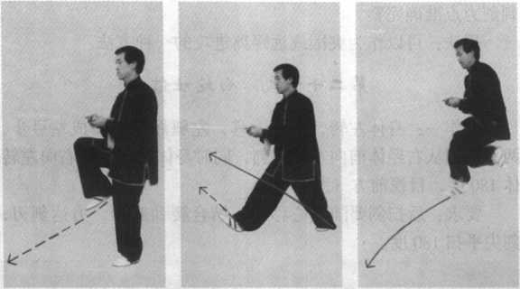 要求:动作一至动作五(图3—53至57)是“野马跳涧” 的全套动作,它要求从动作一提腿开始,迈步、蹬地起跳、腾 空、落地前刺要一气呵成,并要周身合一,起跳轻灵、迅速, 刺剑力点准确完整。