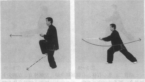 动作五:右脚向前落地,右腿屈膝成右弓步。左腿用力前 蹬,两手持剑向前平刺与腰高,目视前方(图3—57)。