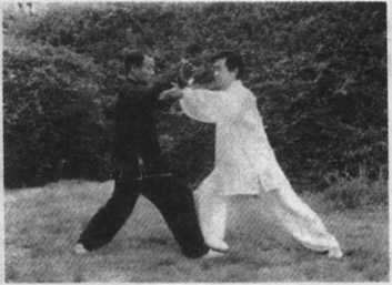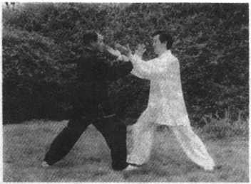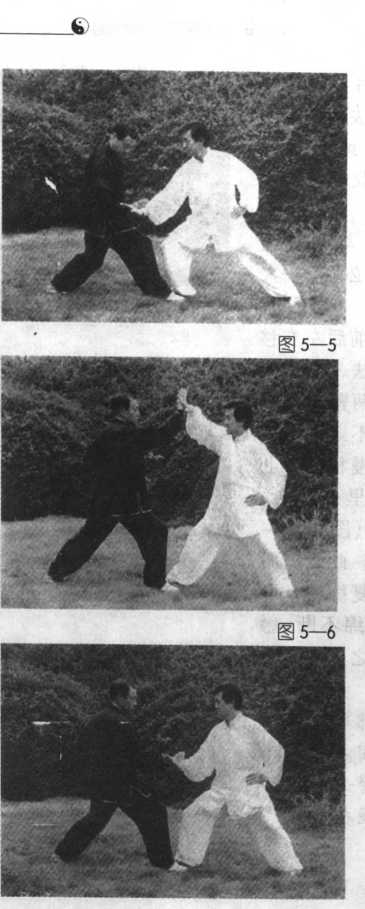 同 单挽花步法相同,双 方上左步或右步均 可,同出双臂两小臂 相接搠住,双方手臂 在里在外均可(图 5—8)o但必须有一人 领劲,另一人随劲, 结合重心前后左右移 动,在身法、腰劲的 带动下,两臂相互缠 绕,连绵不断,沾粘 不散,快慢相间,上 下相随,里外相合, 随机应变(图5—9 ~ 图5—12)0此法周而 复始,反复练习,可 使两臂缠绵不断,触 觉如秤准之灵,其表 现是: