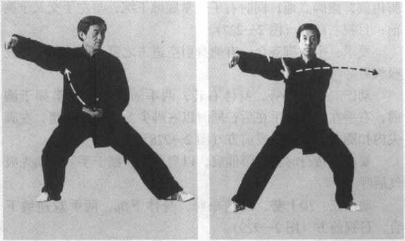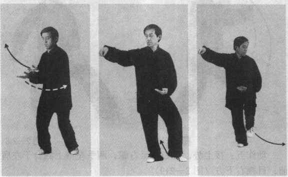 动作六:接上势,身体左 转;左手划外弧线向左拉开; 周身放松,手与脚合,肘与膝 合,肩与胯合,周身上下团聚