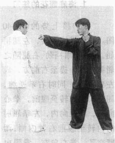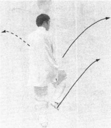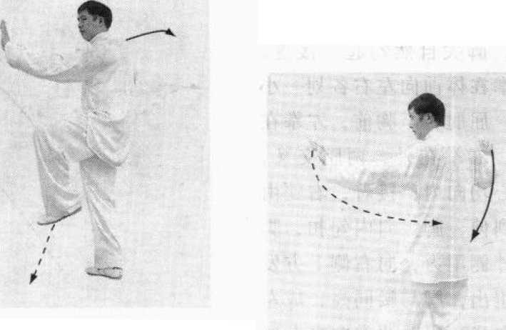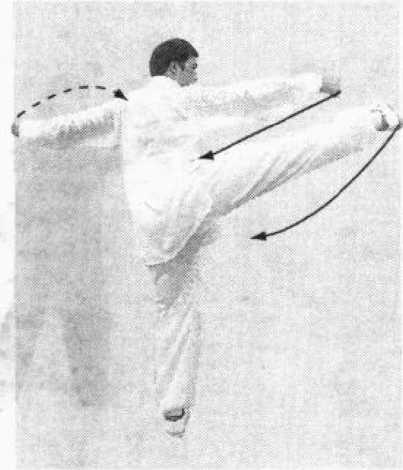 要点:两拳在体前划弧,提膝,身体向内合劲;称为蓄劲。蹬 脚、发拳称为放劲。蹬腿时要注意左脚站稳,不可左右摇摆。