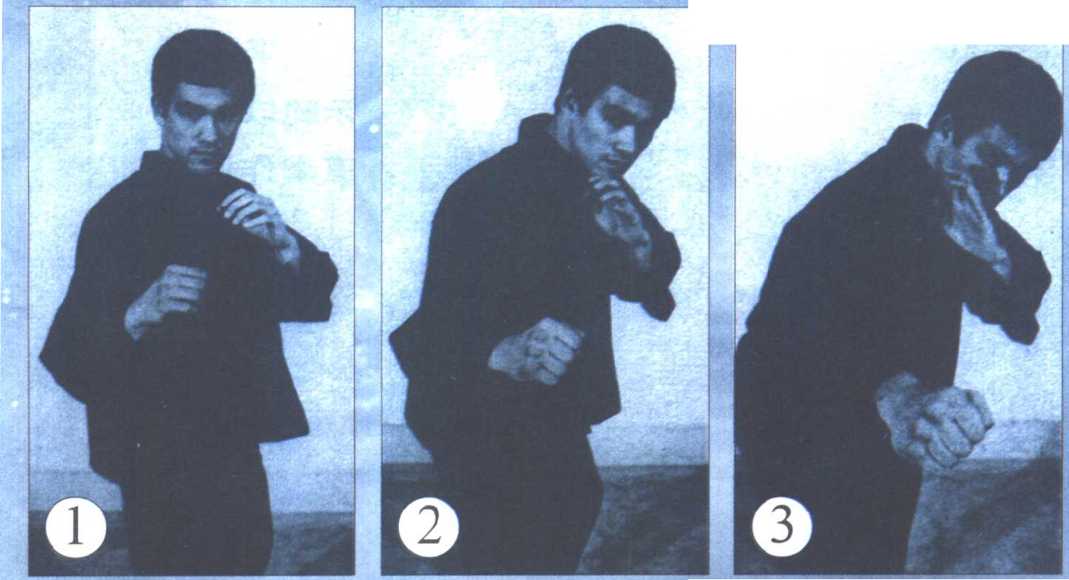 ⑴至⑶,李小龙先发动佯攻, 趁对手受骗把两手升高时,以前手