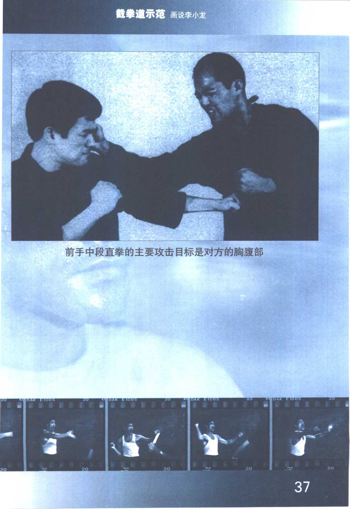有人也称作为“兜心拳”,皆因其攻击目标为心窝,适 用于近身战。前手中段直拳加上腰力及体重,其速度与力度相当不错, 对方除非侧身闪格,否则难以抵御这种来势汹汹的攻袭。李小龙花费不 少心血练就如钢的前臂,其直拳威力惊人。