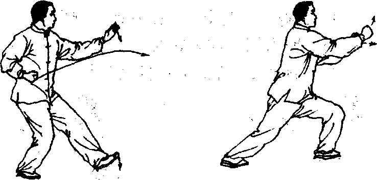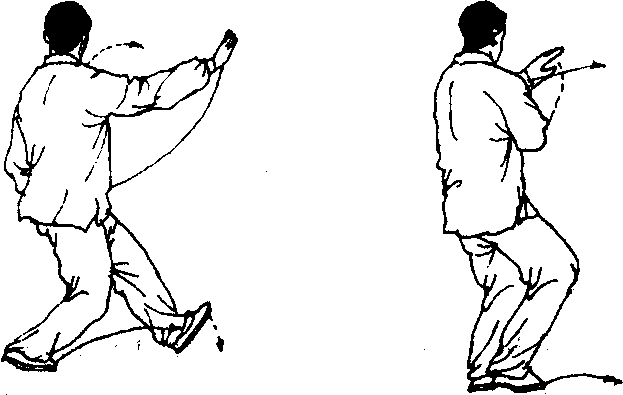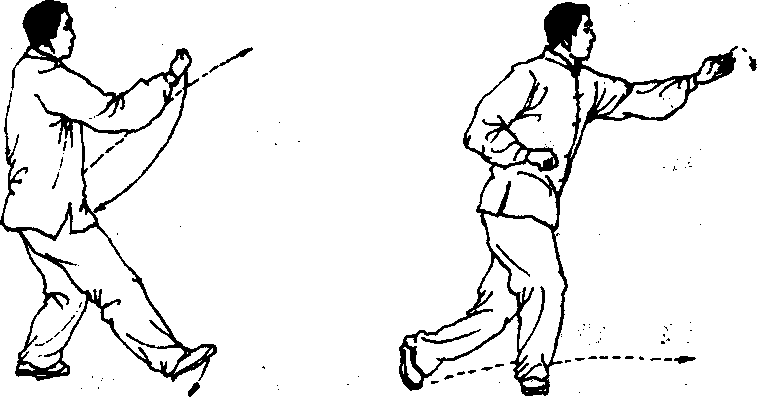 (5) 左脚经右脚内侧向前上一步,脚跟落地,