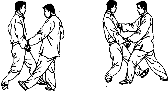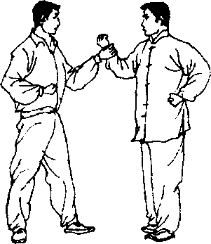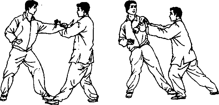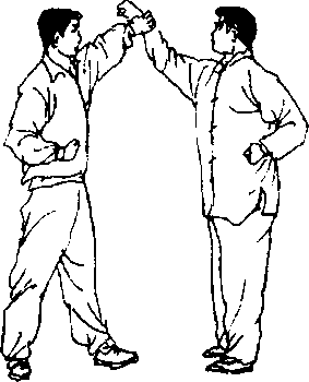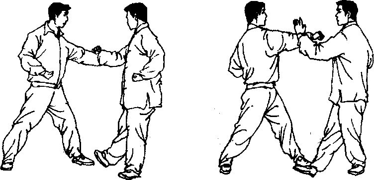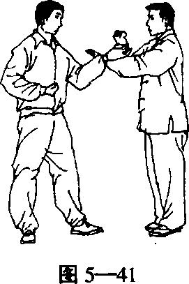 例二:乙方用右拳向甲方面部冲击。甲方右脚 迅速向后退步,用左手臂上架挡住乙方右拳(图 5-39),乙方向右、向下、向左上内旋臂使甲左臂 外旋;右臂从甲虎口中解脱出来(图5-40),然后 左手从甲方左臂下按其左前臂外侧(图5—41),右 手快速粘贴甲左大臂外侧"重心前移,后腿蹬直用 力将甲向后推出(图5—42)o