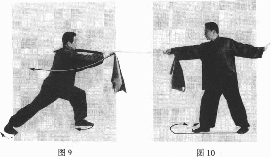 ①右手从身后向前接握刀柄。目随右手。(图9)