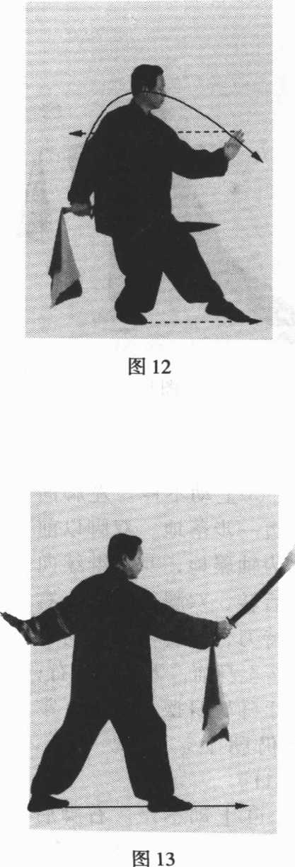 左脚前掌着地成左虚步。同 时,右手持刀臂外旋,从右 肩外侧向后、向左、向前裹 脑缠绕,至身前时向身体右 后下方拉刀,刀刃朝下,刀 尖朝前;左手持刀缠绕向 左、向前、向右弧形绕摆至 右腋前,当右手拉刀时,屈 腕立掌向身前推掌,肘微 屈,掌心朝右,掌指朝上。 目视左掌。(图12)
