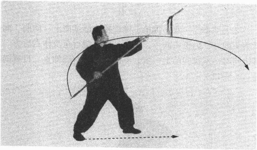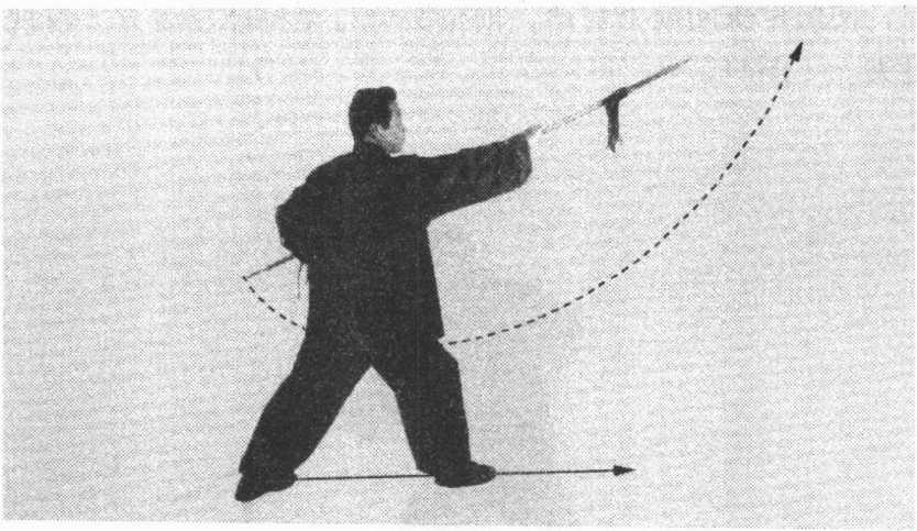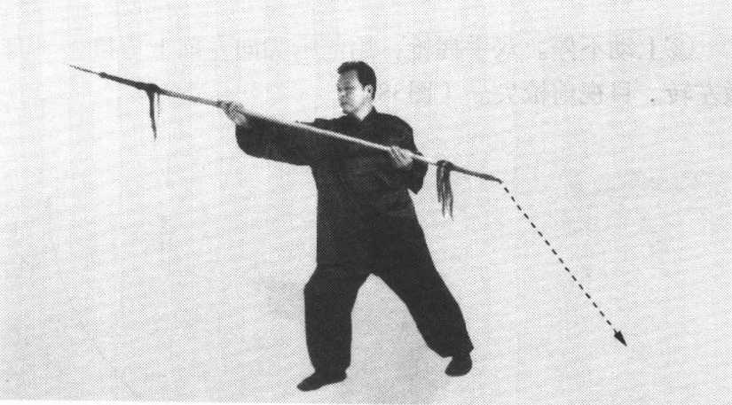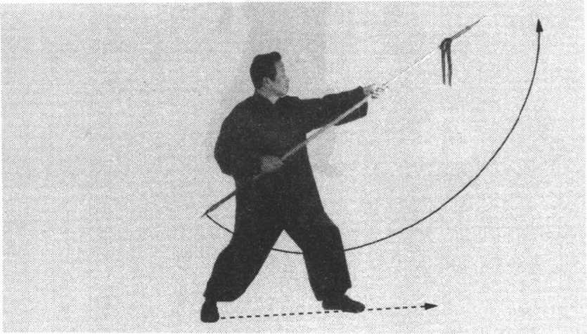 ④上动不停。左脚向前迈一步,腿即屈膝,右腿蹬直。在 左脚上步的同时,双手握枪,用前枪尖向前、向上挑击至头前 上方,后枪头向后、向下落至身体右后下方。目随前枪尖。 (图 40)