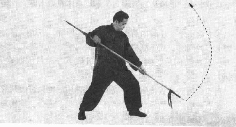 用途:先用后枪头向右后下方拨挂对手攻来之械,后向上 崩挑对方咽喉部位。