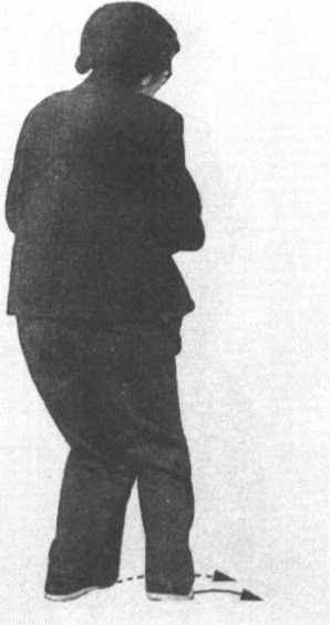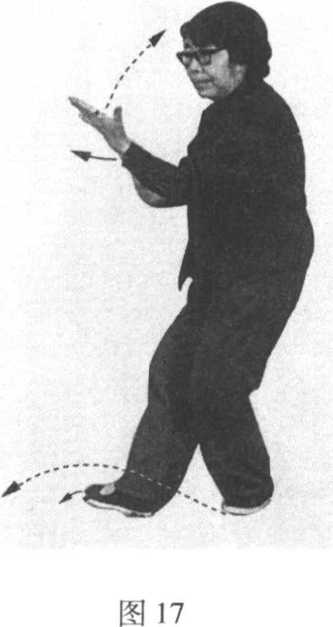 接前式,左手外旋里裹,向下至左胸前,手 心向上,臂微屈;右手向下移至左肘内侧,拇指 一侧对胸,手心斜向下。同时,右足微回撤外 摆,两腿微屈。眼看左手(图17)。