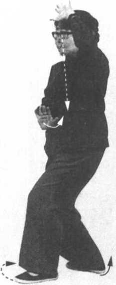 接前式,左足向左前方迈一步;右足随即跟 步至左足后相距10厘米,重心偏于右足。同时, 身体左转。左手内旋向上架于左额上方;右手在 胸前,轻轻向前推出(右肘贴肋),臂微弯曲, 手心向前,指尖向上。眼看前方(图18)。