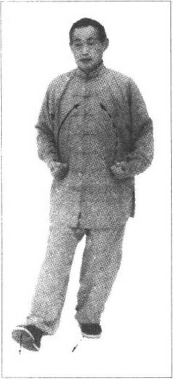 (1)两手臂微内旋,慢慢下落握立拳(拳眼向上,拳心相对),继 而两拳臂外旋收至两胯前,拳心向上,拳眼斜向前;同时,身体重心 (以下简称重心)移向左腿,屈膝坐胯;右腿屈膝,脚跟提起,以脚尖 为轴,脚跟内碾,在两拳内收时,右脚向前上步,脚跟着地(图3)。