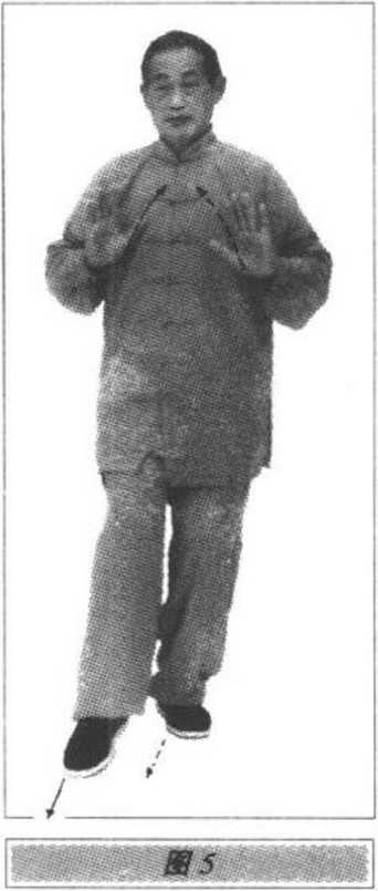 (2)重心前移至右腿,右脚全脚落地慢慢踏实,右腿屈膝坐胯 (以下凡支撑重心的腿都要屈膝坐胯,不再重复);同时,两臂内旋 立拳向前慢慢撞击(不要明显发力),拳眼向上,两拳相距约15厘 米,高与胸平,两肘微屈;左脚与重心前移和撞拳同步,慢慢跟步至 右脚后,脚尖虚着地,两脚相距及横向距离约10厘米;眼看两拳间 (图 4)。
