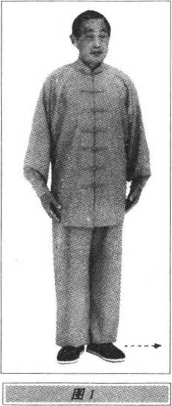 身体自然直立,悬顶(头微上顶),竖项,沉肩垂肘,含胸拔背, 两肩微前合,下须微内收,敛臀收胯;两脚跟相触,两脚尖外撇各约 45。,两手手指微屈自然散开,手心微含,虎口成弧形,两手的指梢 轻贴大腿外侧,中指微向下领伸,两肘微外撑,肘肋之间可容一拳; 嘴唇轻轻合闭,呼吸自然;全身放松,精神集中;眼平视前方(图 Do