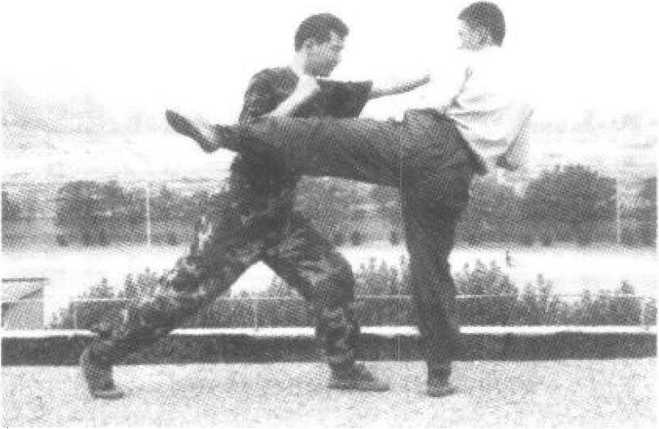 方法:近距离作战中,敌从侧翼,起左膝欲对我实施攻 击,我速提左膝,直顶敌裆部'(图1 -101)