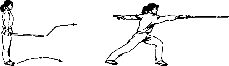 【预备势】并立步握剑(图2-31)。左弓步直刺,左脚向前上一步成弓步,上身左转同时右手握剑 即向身前平伸直刺,拇指一侧朝上,右臂与剑身成一直线。左手剑 指反向身体平举,拇指一侧朝上,目视剑尖(图2-32)。图2-31预备势 图2-32弓步直刺【技术要点】两臂前后平举,右手持剑从腰间向前直刺与左弓步成型要一致,力达剑尖。I练习方法】一人以弓步横格剑防守,体会刺剑与横格剑的攻 防方法。