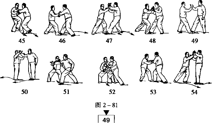 乙靠劲被甲化解,身体右转,左臂挤甲胸部,甲重心移向右腿, 两手下按,左捋使乙挤劲落空,同时左脚提起抢进一步,落于乙右 脚内侧(图 2-81 -53、54)。