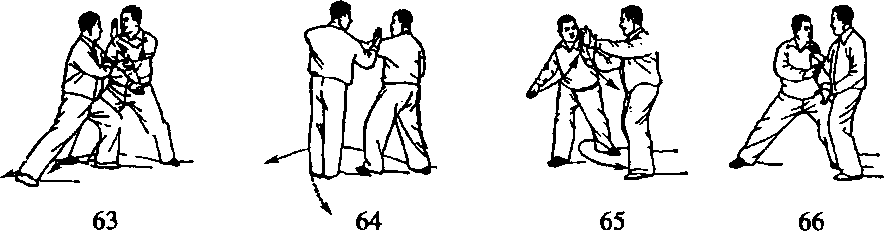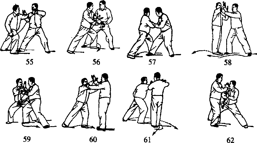 甲被乙靠近身体时,一方面左前臂旋转化开乙的靠劲,另一方 面以右掌顺势直扑乙的面部。此时,乙的右臂应顺势由面前上举, 接承甲之右手腕,左手抚于甲之右肘,身体右转,右脚收回落于左 脚内侧,两手随同身体转动做捋式,甲右脚前进一步,落在乙两脚 前面。乙身体向右转,右腿向右后方再退一步,两手做捋式,甲左 脚前进一大步,右脚再进一大步落于乙左脚内侧,同时,左手附于 右臂内侧,两臂作挤式,靠向乙胸前(图2-82 - 59、60、61、62)。