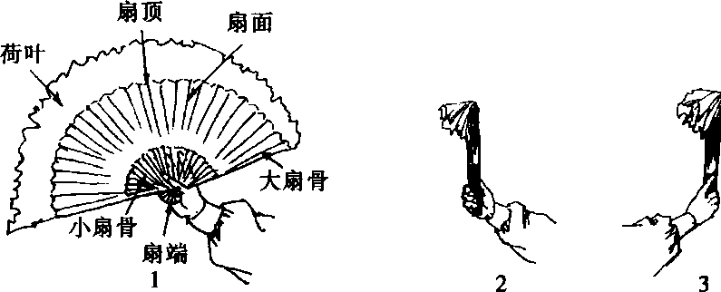 拇指、中指、无名指、小指握扇,食指伸直贴于扇面(图3 -33 -2、3)。