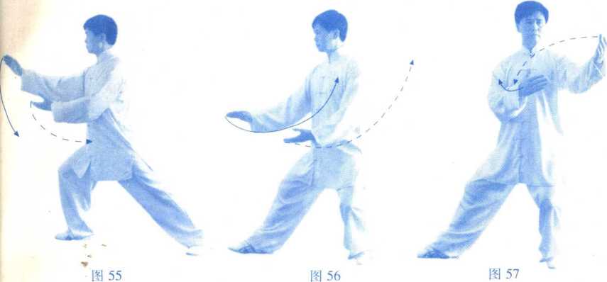 直至左手手心斜向上, 高与耳平;右臂平屈于 胸前,手心向内;眼看左 手。(图 55.56.57)