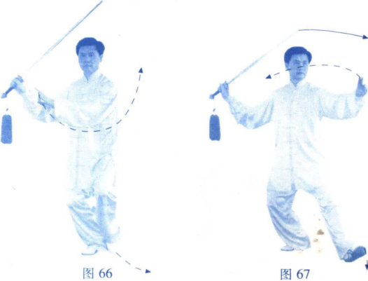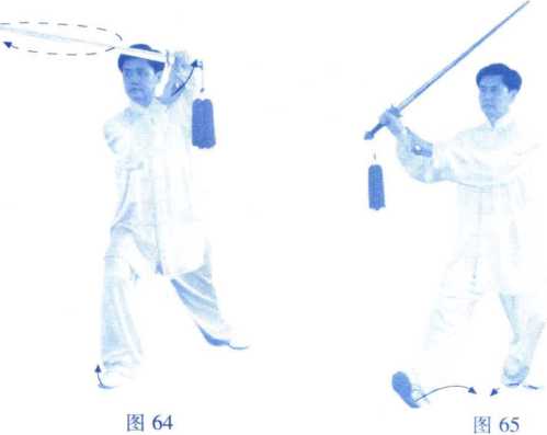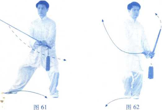 左脚 向左侧迈出,身体重心 移向左腿,然后右脚向 左腿后插出一步,脚前 掌着地,成叉步,同时左 手剑指向里、向下划弧 至腹前,右手持剑臂外 旋先向右前方伸出,再 向左弧形平摆至腹前 将剑交与左手,随即右 手成剑指附于左腕处, 手心向下;左手握剑手 心向下,剑尖高与肩 平;眼看剑尖。(图59、 60)