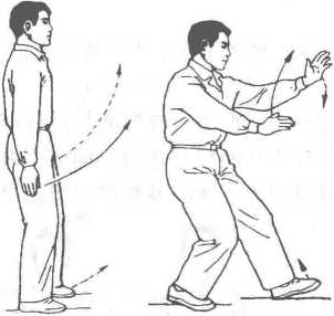 立正站立,重心移至右腿并屈膝(图4-7),左脚向前进 半步,脚跟着地,脚尖翘起,左膝微屈;同时两掌向前上方 举起,左掌指同鼻高,右掌在左肘内下方,两掌指微屈,自