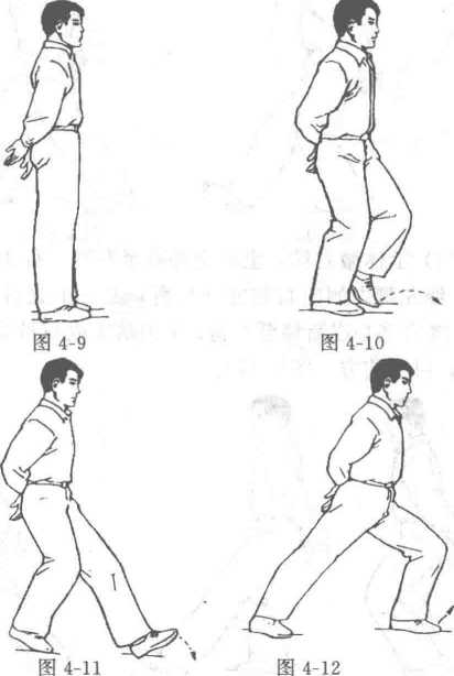 (1)身体重心移至右腿并屈膝,左腿屈膝抬起(图4- 10)。左脚向左前方上一步,脚跟先着地成左虚步(图4-11)。 然后重心逐渐移向左腿,全脚踏实,脚尖向前成左弓步,目 前平视(图4-12)。
