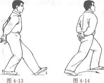 (2)身体重心移至右腿并屈膝后坐,左腿自然伸直,左 脚尖翘起外摆成左虚步(图4-13);然后上体微左转,重心移 向左腿并屈膝,全脚掌踏实,脚尖偏向东北,同时右腿屈膝, 脚跟抬起微外展(图4-14)。?