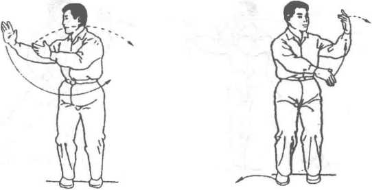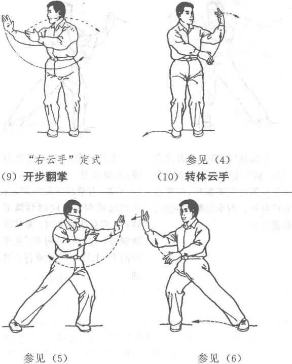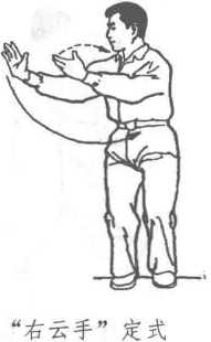 上体右转,重心移至右 腿,左脚收并,两脚相距10? 20厘米。右掌经面前向右,左 掌经腹前向右,同时划弧云 转;云至身体右侧时,两掌逐 渐翻转,右掌心转向外,左掌 转向上。上体和视线随右手移 动。