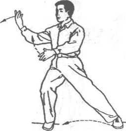 上体左转,重心 移至左腿。左掌经面 前向左,右掌经腹前 向左,同时划弧。上 体和视线均随左手 移动。