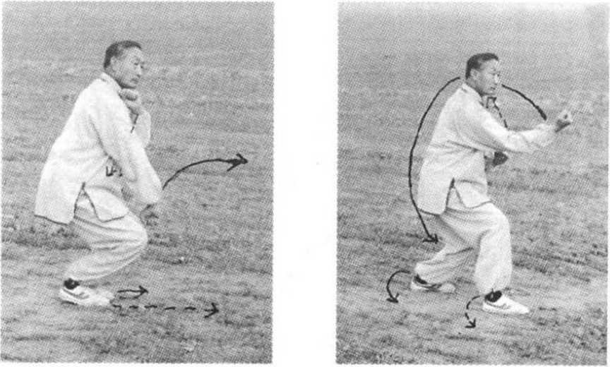 ③ 此形主练身法,它模仿鸥子束翅翻身之能,入林钻天之 妙。练习时要求手、眼、身法、步配合默契,肩、腰、胯、腿 转动轻灵快速,并要掌握好平衡,做到形象逼真,动作准确, 劲力完整,刚柔相间,阴阳互换。