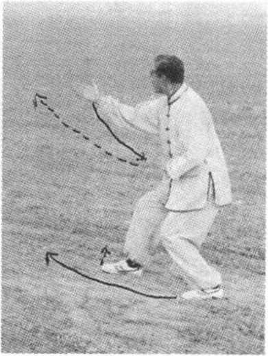 (1)除左脚向前垫步(长约一脚)外,起势动作与“上步 左蛇形”的“⑴”相同,唯左右方向相反(图5-76)。