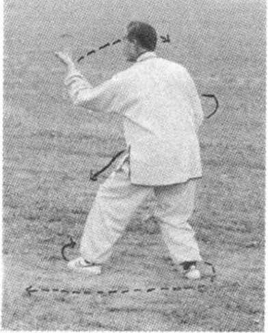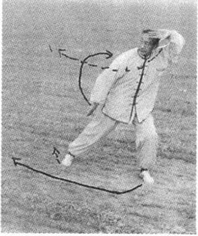 ② 插步转身要与两掌穿插动作协调,同时全身放松,转身 时头稍低一点,身稍左倾,含胸,拧腰,肩臂转动柔灵、圆 活、敏捷,动作连贯,不能停顿与僵滞。