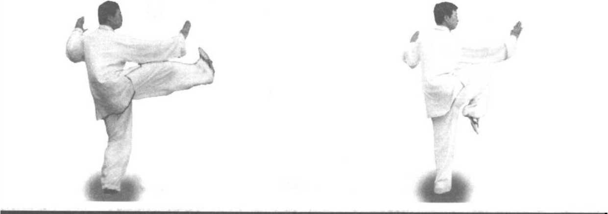 技击含义:此动作左腿的独立支撑时,身体向上拔起要做到虚领顶劲,尾闾