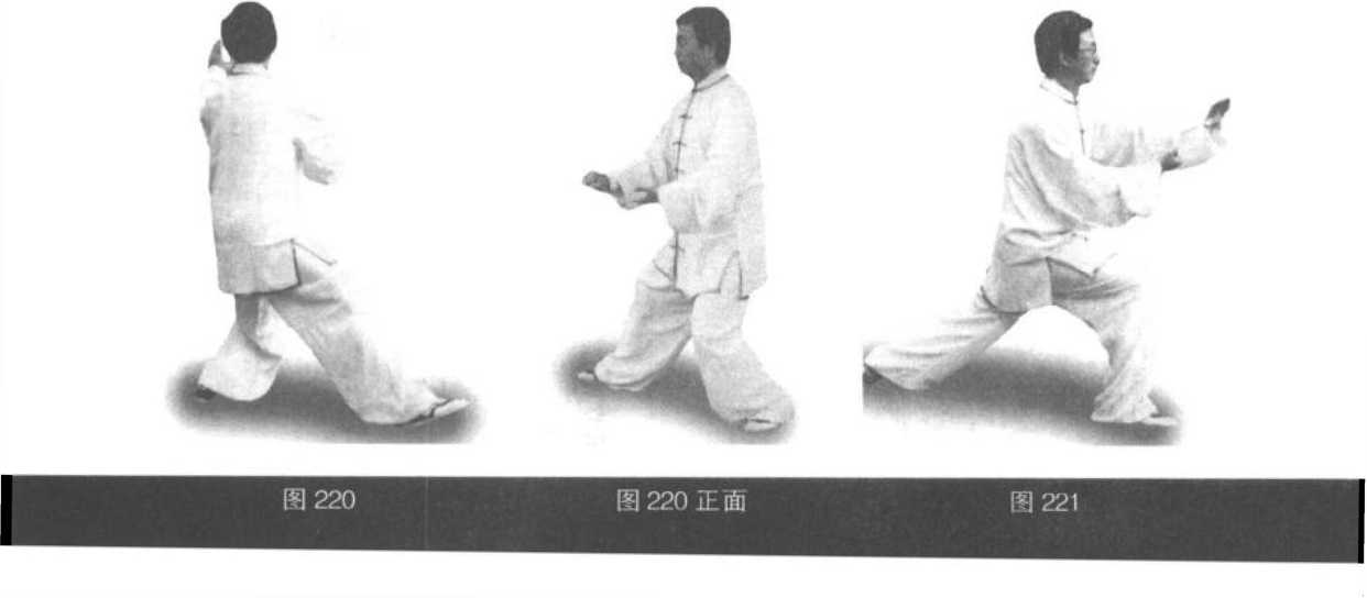 动作2:身体微向左转,重心于左腿,左腿屈蹲,右脚向右前迈出,脚跟先 着地;随身体转动;左掌向上、向左上划弧至左肩外,掌心向外,掌指向上,腕 与肩平;同时右掌变拳向下划弧至腹前,拳心向下,拳眼向内;眼视左掌方向 (图 220)。