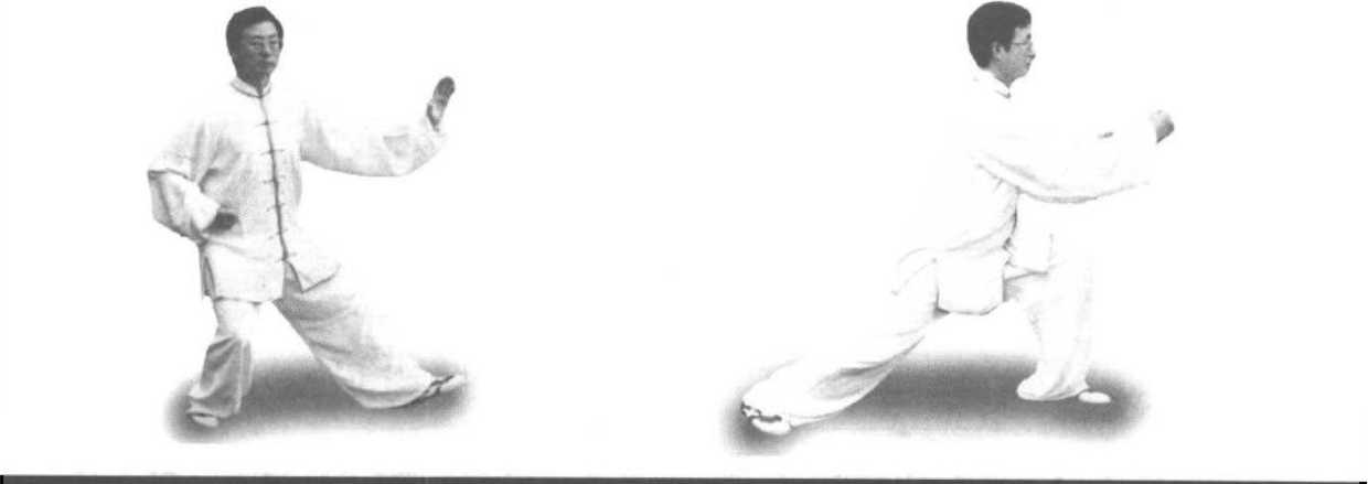 动作要领:(1)身体的转动带动双掌的动作与弓步要同时协调完成。(2)上 体正直,双肩松沉,双臂撑圆。(3)左掌、右拳之间以一拳距离为宜。