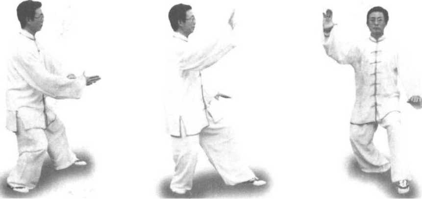 动作要领:(1)双掌运转与迈步动作协调一致。(2)双臂呈弧形,右掌向体 右后侧划弧应在体右后侧45度为宜。(3)迈步时身体重心必须坐实,以保持身 体平衡。
