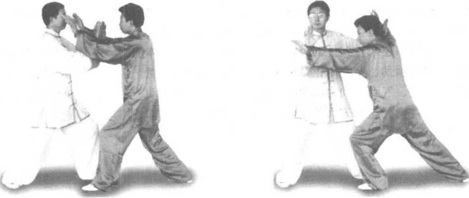 技击含义:对方双手进击我面部,我以双掌将对方双手分撑开,破坏其来 势。如对方进击我腹部,我以下棚接其来势,趁对方回收之时,我顺势用合棚将 对方合劲送出。(图43、44、45、46)