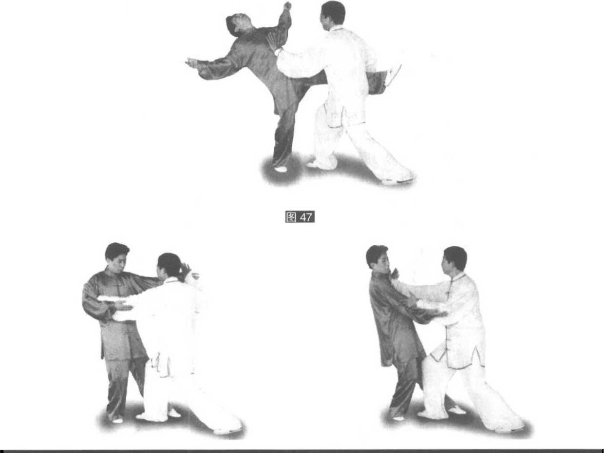 技击含义:对方由右后进击,我急转身躲闪的同时右掌防下,左掌击上,并 上步进击。如对方以左手推我左臂,我则趁势双掌扶其臂膀以四正手的方式将其 发放。(图 47、48、49)