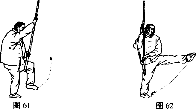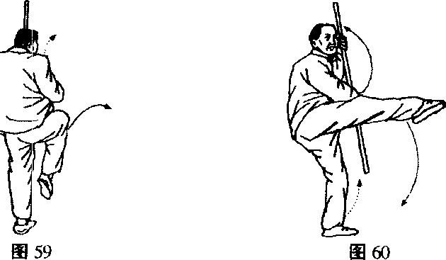 2.左分脚落右足向右跨,重心移至右腿,提起左足成右 独立步,同时右手持棍由下向右再走弧线翻上停右额旁,左手随 之持棍由上向左翻下,此时双手持棍在右侧,接着左足绷平脚 面,以足背外侧由东南向东北方向横踢。(图61、62)右尹运棍 示意图。